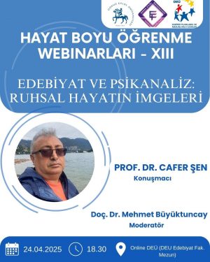 Bölümümüz Öğretim Üyelerinden Prof. Dr. Cafer ŞEN, 24 Nisan 2025 tarihinde Doç. Dr. Mehmet BÜYÜKTUNCAY moderatörlüğünde düzenlenen “Hayat Boyu Öğrenme Webinarları – XIII” adlı webinara “Edebiyat ve Psikanaliz: Ruhsal Hayatın İmgeleri” başlıklı konuşması ile katılım sağlamıştır.